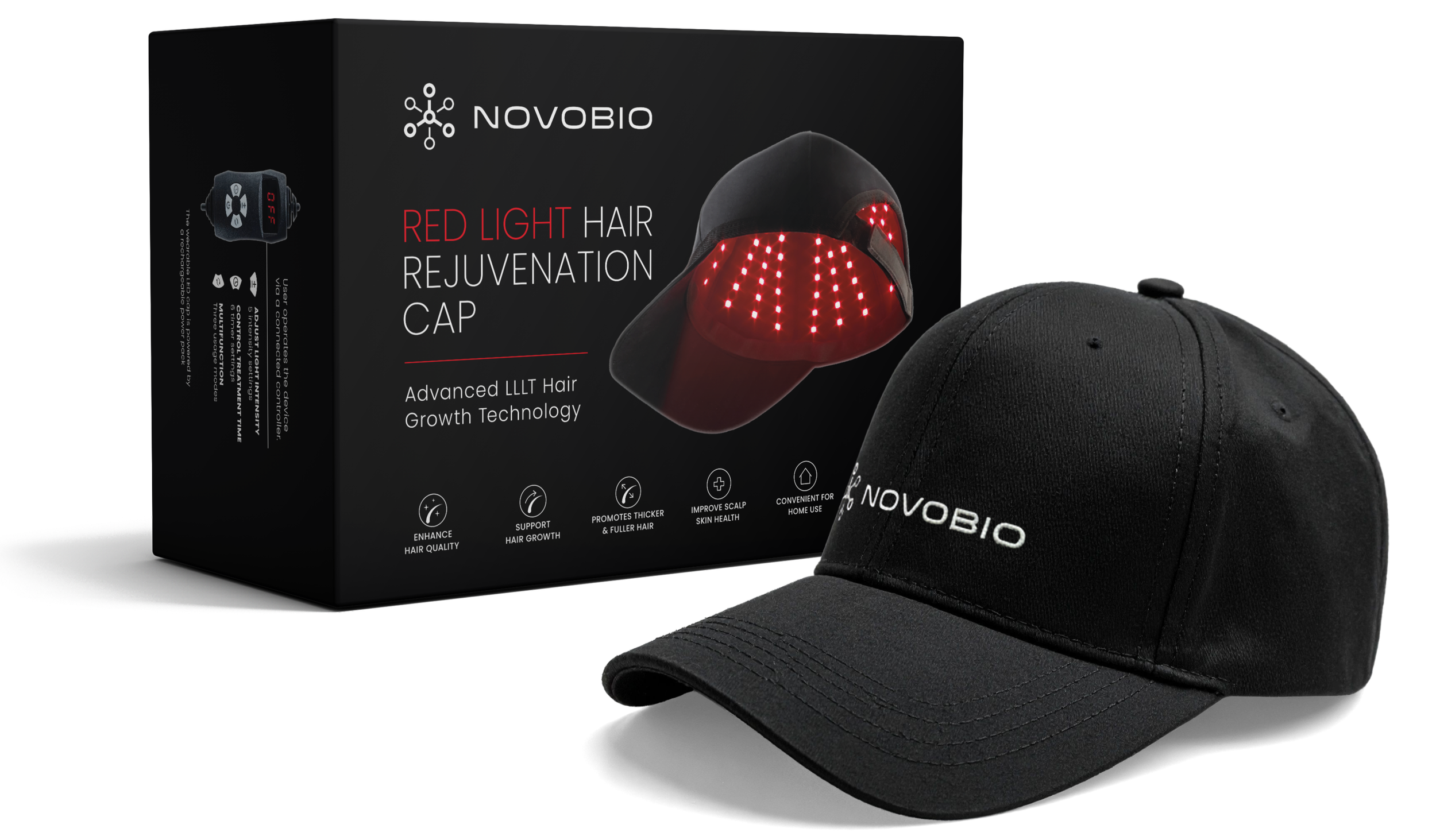 The Novobio Red Light Hair Cap is a hands-free, at-home device that uses red (660 nm) and near-infrared (850 nm) light to support scalp health and promote stronger, thicker hair. It is a non-invasive, low-risk option for individuals experiencing early hair thinning or pattern hair loss.