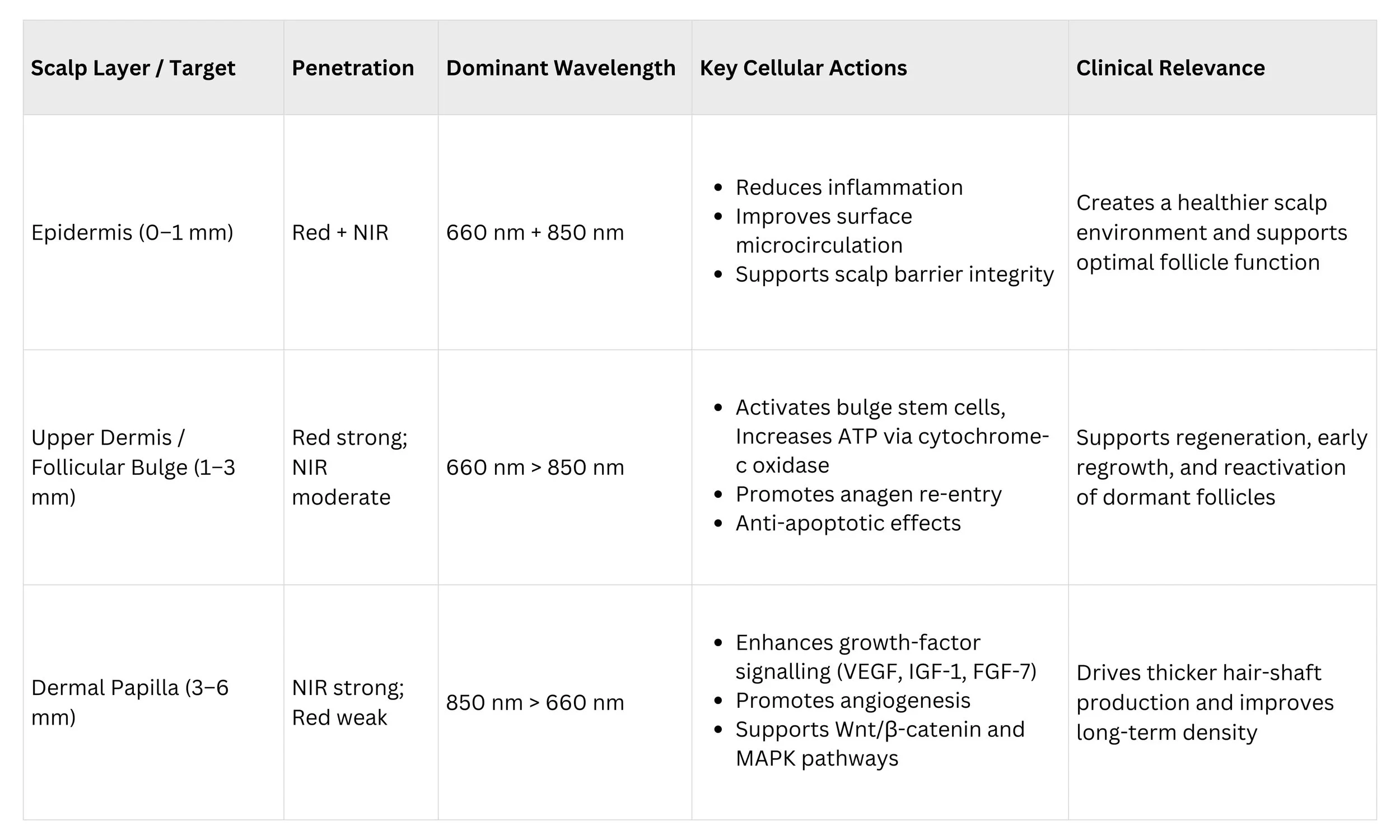 Low-level light therapy (LLLT) photobiomodulation (PBM), improves hair growth by enhancing the energy production of hair follicle cells. Red (around 650–660 nm) and near-infrared (800–900 nm) wavelengths are absorbed by mitochondria, the structures responsible for cellular energy. This interaction boosts ATP production, helping weakened or miniaturising follicles function more effectively.